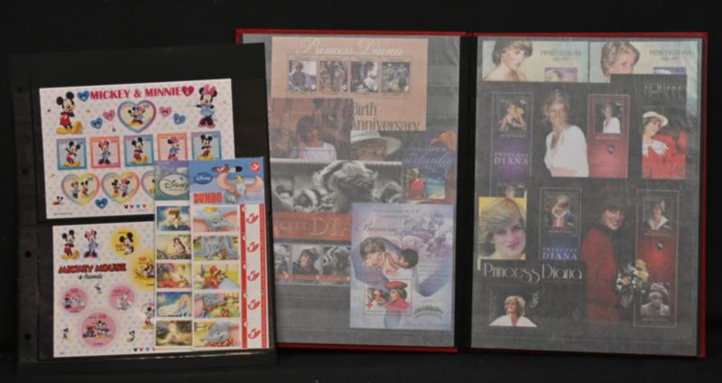 Pricess Diana material in a stockbook. Plenty of MNH ** miniature sheets from various countries etc. Also some Disney stamps, eg. four MNH ** Japanese miniature sheets (Image)