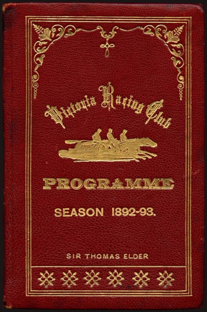 Programme 'Victoria Racing Club, Programme, Season 1892-93' with red leather covers with gilt titles & named to Sir Thomas Elder, includes nominations for the major races including the Victoria Derby & Melbourne Cup; and previous winners of the major races, very fine. (Image1)