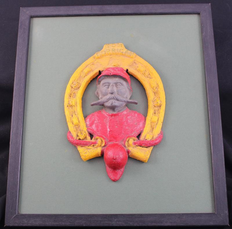 TOM CORRIGAN: Metal plaque with bust of the jockey inside horseshoe, mounted on board, size 30x34cm, Fair condition (painted in garish colours). [Tom Corrigan was a hugely popular steeplechase jockey who died in 1894 as a result of injuries sustained while racing. He was inducted into the Racing Hall of Fame in 2017] (Image1)