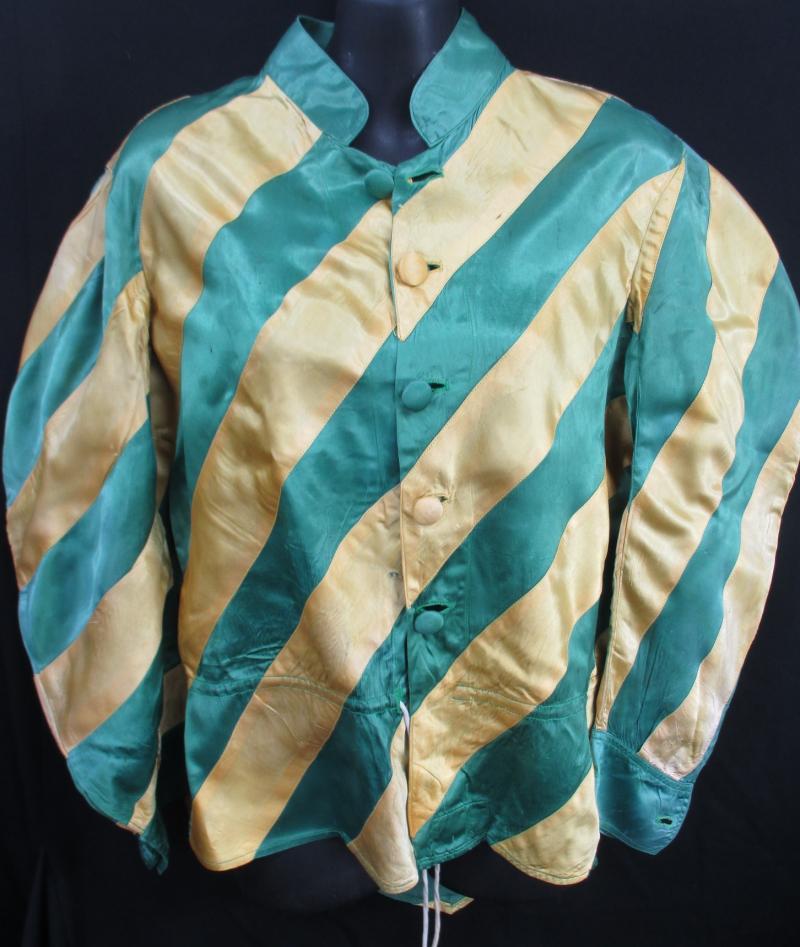 BART CUMMINGS: circa 1970s Bart Cummings silks, green & gold diagonal stripes, made by Tailors Ltd, Adelaide, that were presented by Bart to jockey John O'Loughlin who rode trackwork for Bart for about 5 years, Fine race-worn condition. [In 2013 in recognition of Bart's 60 years milestone as a trainer, the Australian Racing Board protected Bart Cummings' famous green and gold silks until 2063] (Image1)