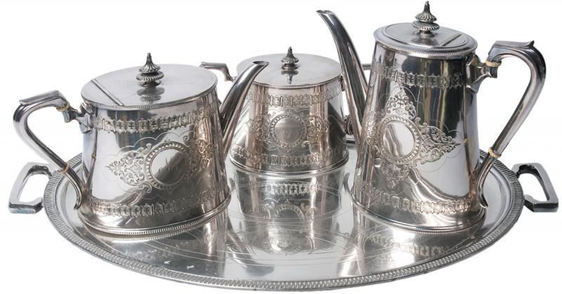 FRANK MUSGRAVE: Silver plated coffee set, comprising oval tray engraved 'To/Mr & Mrs Musgrave/from CMG/Xmas 1914', plus coffee pot, tea pot & sugar caddy, mainly Fine/Very Fine. [Frank Musgrave (1860-1944) was the trainer of Ajax and other famous racehorses]. (Image1)