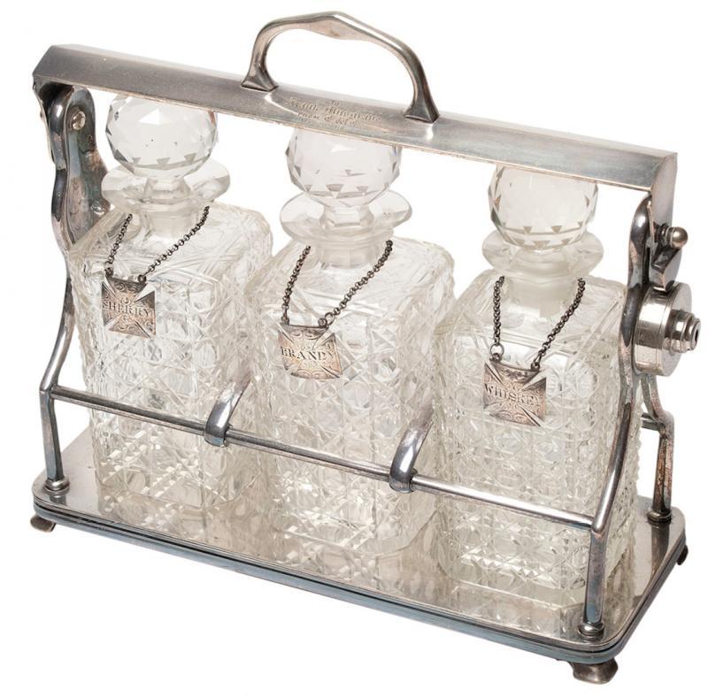 FRANK MUSGRAVE: Silver plated tantalus, with decanters for Sherry, Brandy & Whiskey, (with key to stop the servants taking a sip), engraved on top 'To Frank Musgrave from CMG, March 1916', mainly Fine/Very Fine. [Frank Musgrave (1860-1944) was the trainer of Ajax and other famous racehorses]. (Image1)