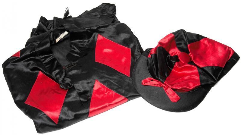 FRANK MUSGRAVE: Silks, black with red diamonds, together with red & black cap,made by 'Alex Morrison, Bourke Street, Melbourne', mainly Fine/Very Fine. [Frank Musgrave (1860-1944) was the trainer of Ajax and other famous racehorses]. (Image1)