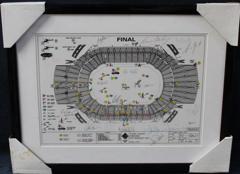 Autographs Plan of Sydney Olympic Stadium signed by 16 broadcasters (with names on reverse), framed, 54x42cm; plus poster for 'On the Couch' signed by Mike Sheahan, Gerard Healy & Robert Walls, framed 46x60cm. Ex Gary Fenton collection.