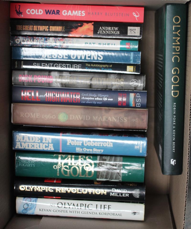 Books 1956 Melbourne Olympics press clippings in large folder; books (24) including 'Olympic Saga' by Donald & Seth [Sydney, 1957], 'Olympic Diary Rome 1960' by Allen [London, 1960] & 'Pursuit of Excellence - The Olympic Story' edited by Churchill [USA, 1976]; 'Official Olympic Souvenir programme' for 1984 & 1996; plus magazine, mainly Fair/Fine. Weighs 23kg.