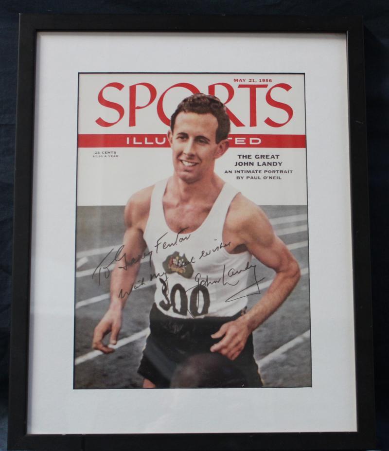 Framed displays Signed displays of John Landy & diver Vyninka Arlow; print 'Michel Delacroix - 1896 Olympic Celebration'; 1948 Torch Runner in Stadium; newspaper banner '$176m TV GAMES COUP'; Moscow mascot menu, all framed, various sizes. Ex Gary Fenton collection.