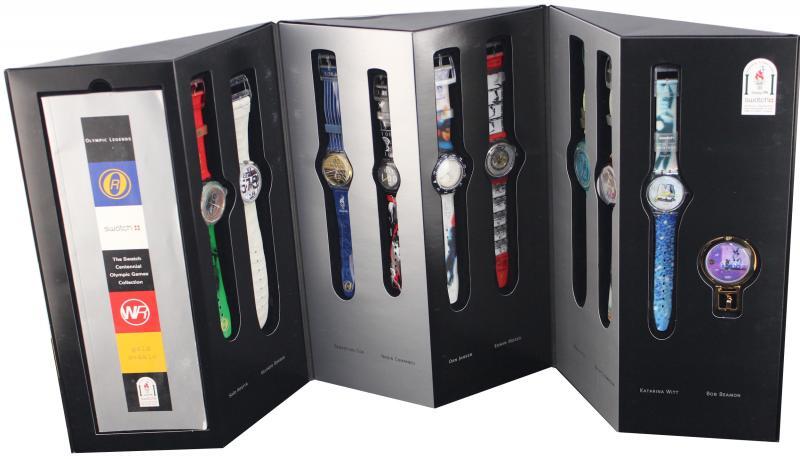 Watches c.1992-2000 collection, with 1996 'Swatch Historical Olympic Games Collection' (set of 9 in box); 'The Swatch Centennial Olympic Games Collection' (set of 9 in chinese-puzzle box); 'The Swatch Centennial Olympic Games Collection - Olympic Legends' (set of 10 in triangular box); other Swatch (5); Barcelona 92 (2); Nagano 98 (2); Sydney 2000 (1); IOC Executive Board Member Kim Un-Yong (1); Channel 7 (4) & NBC (3), mainly Fine. Ex Gary Fenton collection.