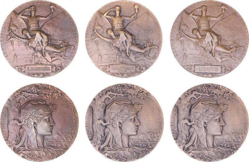 1900 Paris Olympics 1900 Paris Exposition Universelles Internationale three medals in bronze, 64mm diameter, designed by JC Chaplain, named to 'Ecole Speciale de Travaux Publics A Paris', 'Louys' & 'K Almstrom', Fine condition. [The 1900 Olympics were part of the 1900 Exposition, and as no Olympic participation medals were made, collectors often add this medal to their collection]. Ex Gary Fenton collection.