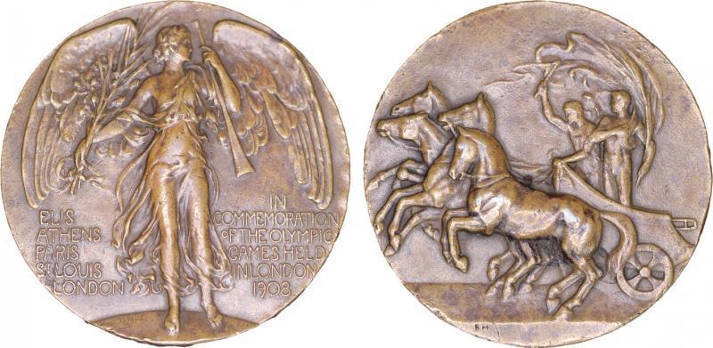 1908 London Olympics Participation Medal, in bronze, 50mm diameter, designed by Bertram Mackennal, winged Fame standing on globe holding palm branch & horn, reverse winner in quadriga dashing left, Fine condition. Ex Gary Fenton collection. (Image1)