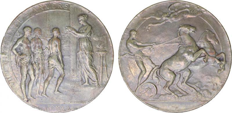 1920 Antwerp Olympics Participation Medal, in bronze, 60mm diameter, designed by P Theunis, Nike standing before tripod crowning victorious athletes, reverse flying victory crowning charioteer in biga, Fine condition. Ex Gary Fenton collection. (Image1)