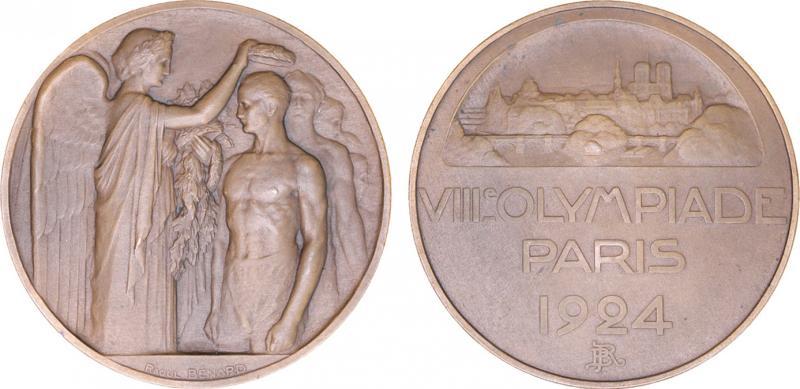 1924 Paris Olympics Participation Medal, in bronze, 55mm diameter, designed by R Benard, Paris city view over 'VII OLYMPIADE, PARIS, 1924', reverse Victory with laurel wreaths crowning victorious athletes, Fine condition. Ex Gary Fenton collection. (Image1)