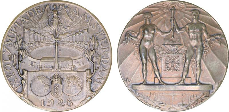 1928 Amsterdam Olympics Participation Medal, in bronze, 55mm diameter, designed by JC Wienecke, nude male & female athletes holding torch over Olympic flame, reverse Nike over stadium, shield of Amsterdam between two hemispheres, Fine condition. Ex Gary Fenton collection. (Image1)