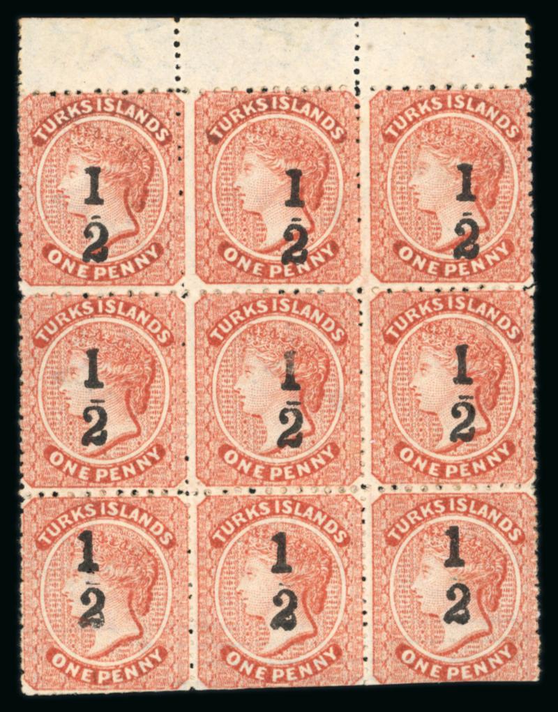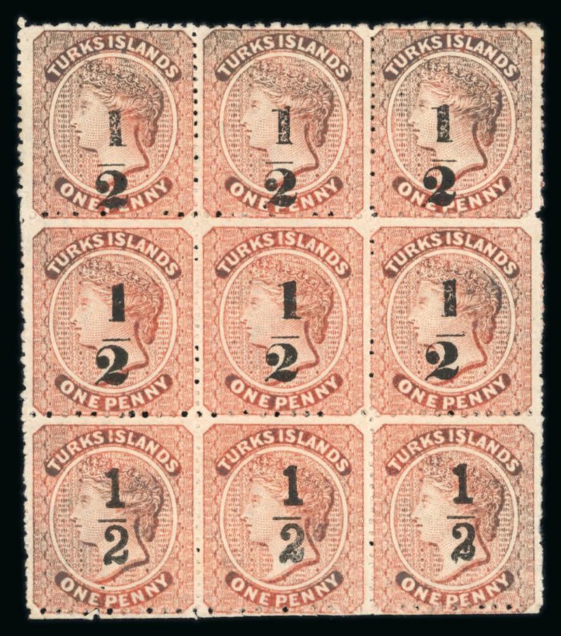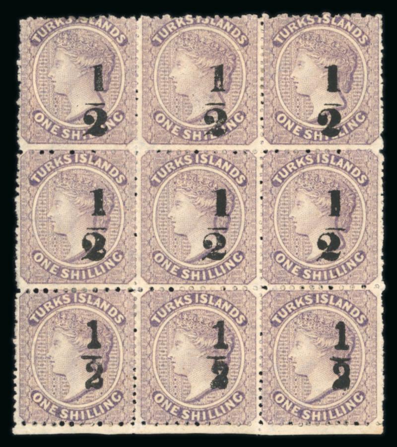 1881 1/2 on 1s lilac block of nine (3 x 3) watermark Small Star sideways, perforation 11-12 x 14.5-15.5 block of nine, the upper two rows surcharged type 9 and lower row type 10 in black, some paper adhesion at left side otherwise fresh large part o.g., a fine and desirable multiple, David Brandon Cert (2004) (Image)