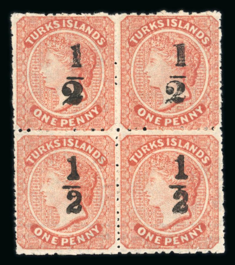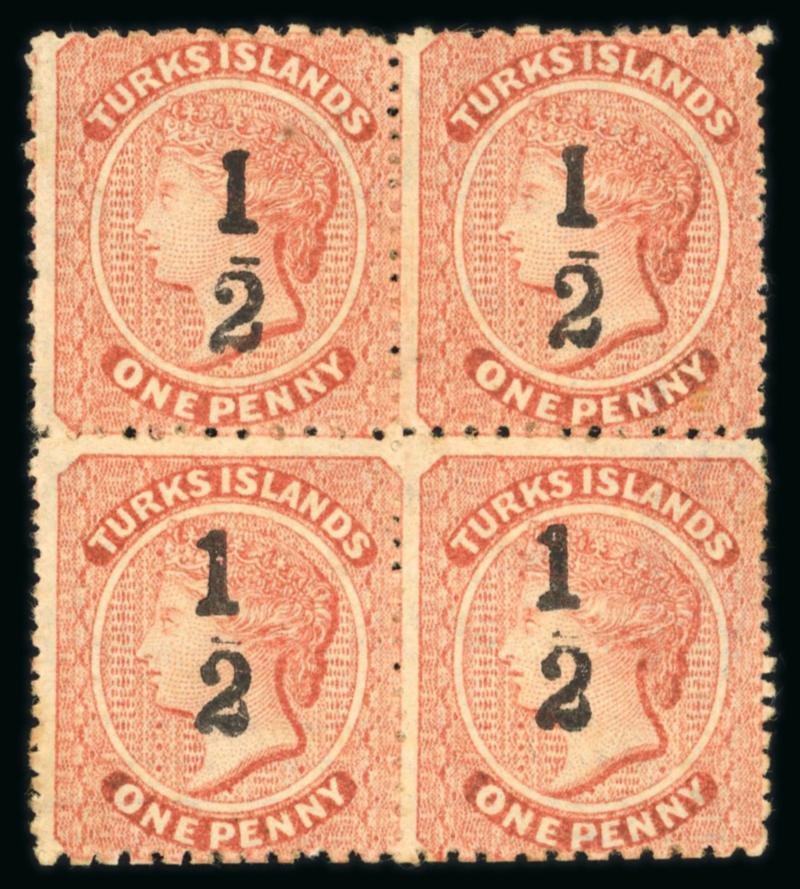 1881 1/2 on 1d dull red in mint block of 4 with large part o.g., the upper pair with surcharge type 9, the lower pair type 10. A fine multiple; cert. R.P.S. (1987) (S.G. £360+). (Image)