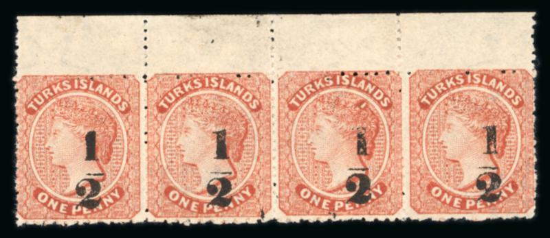 1881 '1/2' on 1d dull red (type 9) from Setting X in upper marginal horizontal strip of four with large part original gum. A fine and scarce multiple; cert. R.P.S. (1977). (Image)