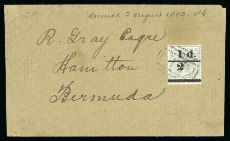 1893 1/2d on 4d grey, setting 4 (bars 11mm apart) tied to wrapper sent by "T1" barred oval, sent inter-island to Bermuda, with ms arrival notation by recipient at top, fine and scarce usage (S.G. £180 x 5). (Image)