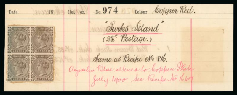 1900 De La Rue undenominated dummy stamp in block of 4 on piece from the printer's archive book, inscribed No. 974, Colour 'Copper Red', 'Turks Island 2 1/2d Postage'. A scarce and unusual addition to a Turks collection. (Image)