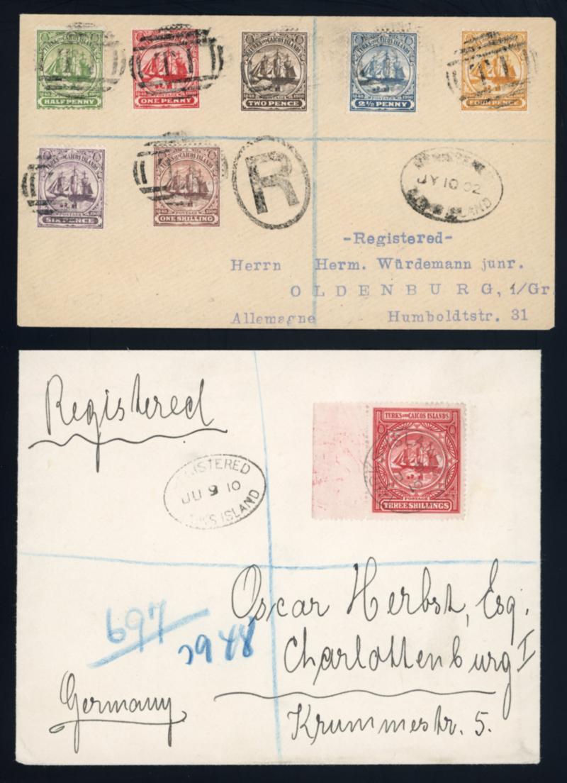1902-10, First Issue registered covers with short set 1/2d to 1s and another cover with the 3s lake as single franking, both to German Empire, very fine and beautiful ships thematic. (Image)