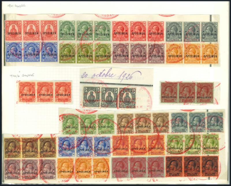 1913-28, collection of "SPECIMEN" stamps from the Madagascar archives, incl. 1913 5d, 6d, 1s, 2s (SG138 & 138b) and 3s, War Tax (Dec) 1918 3d, 1918 (Jun 1d) and 3d, 1921 set of 8, 1922-26 set of 14 and 1928 set of 11, with three of each (mostly in strips) tied to pieces by "POSTES ET TELEGRAPHS / COLLECTION / DE / BERNE / MADAGASCAR", a unique group. (Image)