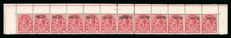 1917 War Tax 1d red in upper marginal horizontal strip of 12 unused without gum (a little hinge reinforcement), the left hand pair showing 'ovpt omitted (in pair with normal)', the strip also with 'double opt at top (in pair with normal)'. A most striking and scarce positional item. (Image)