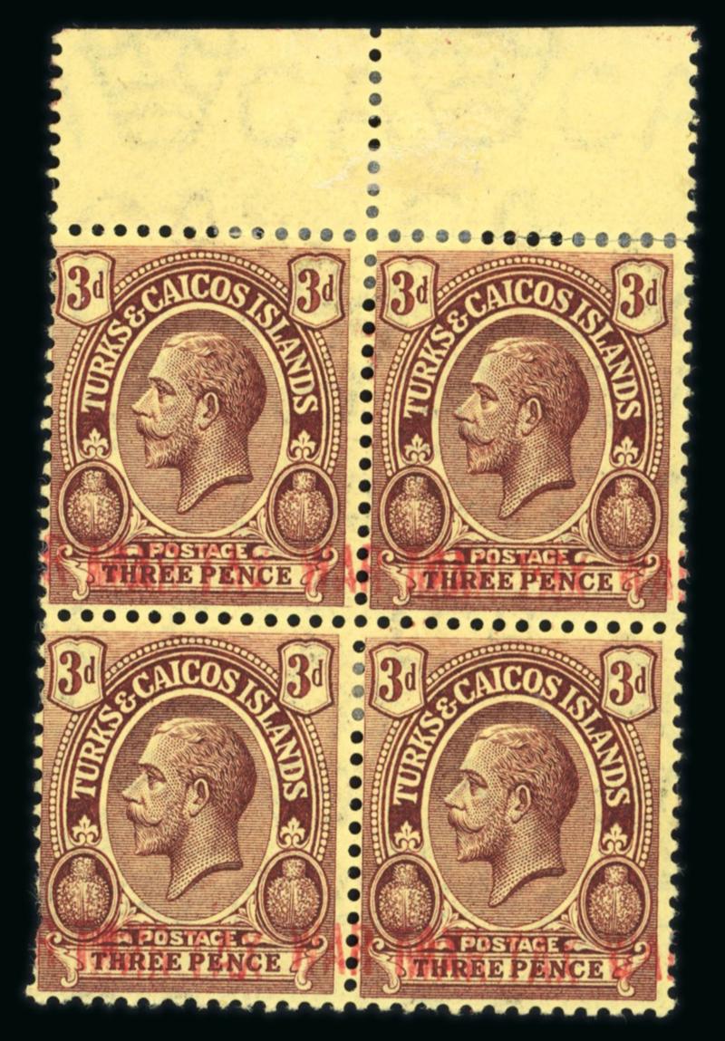 1917 War Tax 3d purple on yellow with overprint type 40 in red in upper mint marginal block of four, each with variety 'ovpt double'. The lower left stamp is defective at left, so 3 fine, lightly mounted examples; cert. Brandon. (2003) (S.G. £1'300). (Image)