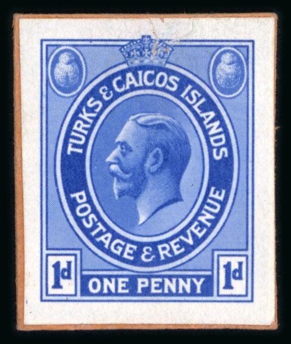 1928 Harrison undapoted essay for the 1d in bright blue, produced in photogravure, stamp-size and affixed to card, tear at top, thought to be one of only two known (the other ex Ludington). (Image)