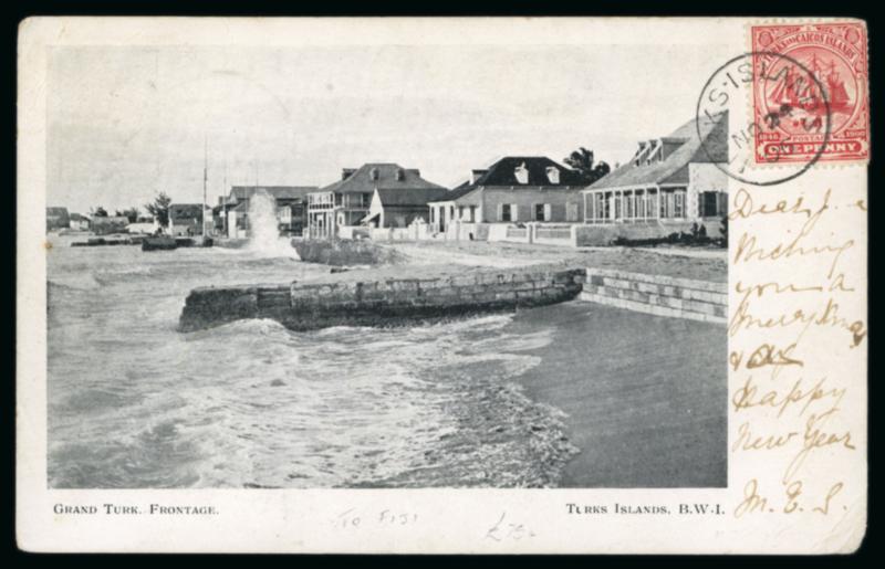 Picture Postcards: 1905-36, group of 17 picture postcards, mostly from 1905-1910, with various scenes (incl. real photo postcards), with several depicting salt production, American Consulate, Palm Grove, Lighthouse on Grand Turk, Front Street, Back Street, coastal scenes incl. one sent to Fiji, plus two of Bermuda ppc's sent from Turks (19). (Image)
