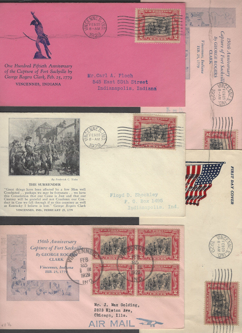 651 "2 c. George Rogers Clark", Feb. 25, 1929 Issue, 15 Diff. Cacheted F.D.C.'s, With Addr., 1 with a Blk. of 4, Sound Cond., F-VF, SCV is About $500.00 (Image)