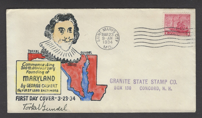 736 "3 c. Maryland", March 23, 1934 Issue, First "Torkel Gundel" Cachet on a F.D.C., Sound Cond., VF, SCV is $250.00 (Image)
