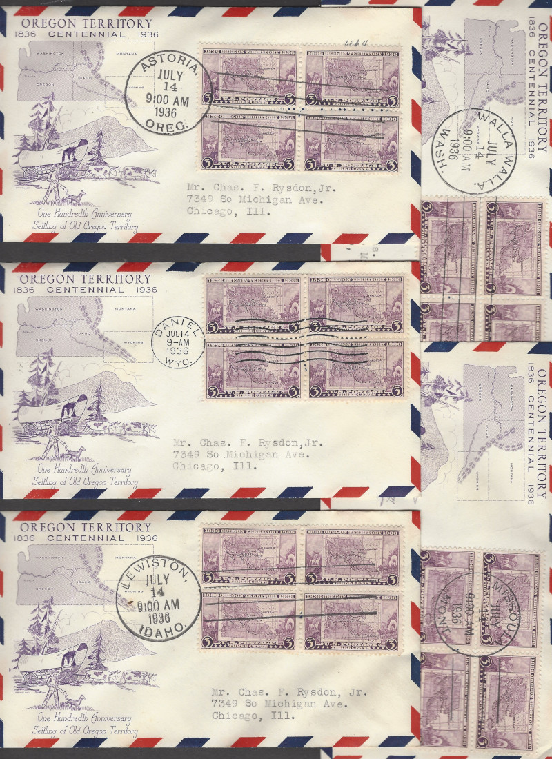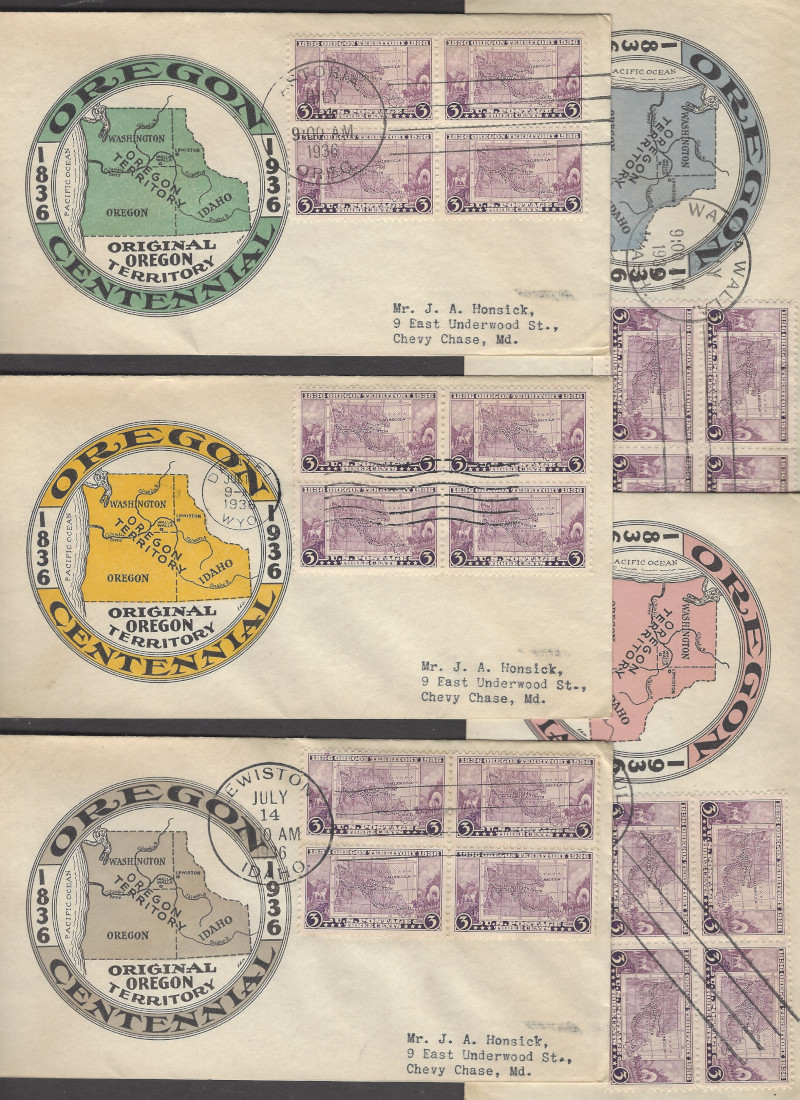 783 "3 c. Oregon", July 14, 1936 Issue, 50 Diff. Cacheted F.D.C.'s (10 Cmpt. Sets), 1 Set is Blks. (4 Stamps Each), Sound Cond., F-VF, SCV is About $600.00 (Image)