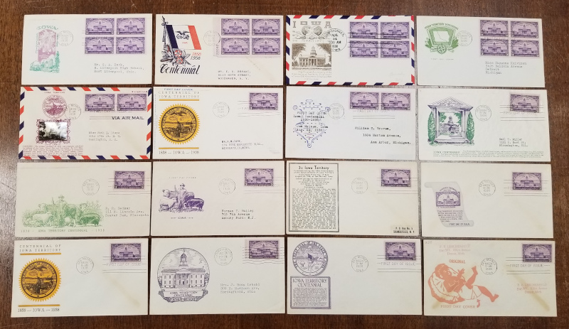 838 "3 c. Iowa", Aug. 24, 1938 Issue, 40 Diff. Cacheted, F.D.C.'s, Includes 4 with Blks. of 4, Sound Cond., F-VF, SCV is About $400.00 (Image)