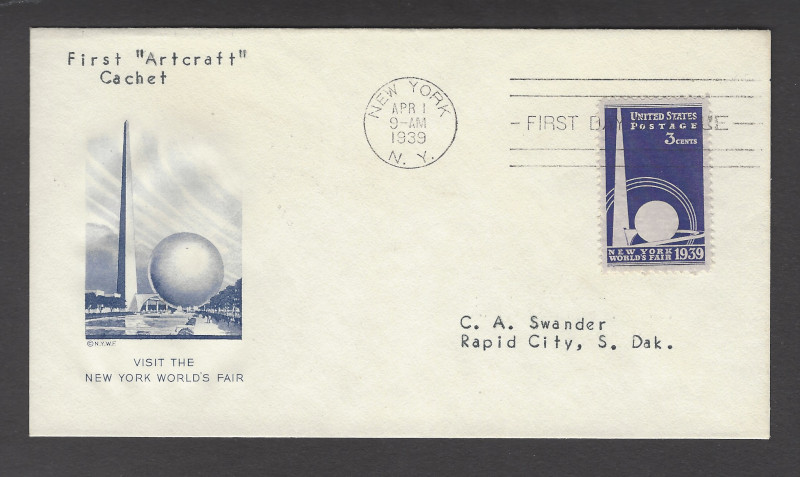 853 "3 c. World's Fair", Apr. 1, 1939 Issue, First F.D.C. with "ArtCraft" Cachet, Sound Cond., VF, SCV is About $300.00 (Image)