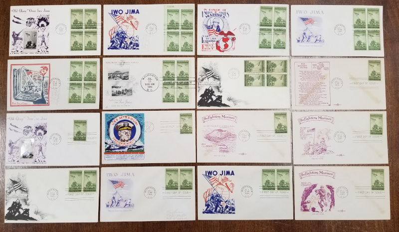 929 "3 c. Iwo Jima", July 11, 1945 Issue, 31 Diff. Cacheted F.D.C.'s, Includes 7 with Blks. of 4 and 6 with Pairs, Two have "Crosby" Cachets, All are No Addr. or Light Pencil Addr., Sound Cond., F-VF, SCV is About $650.00 (Image)