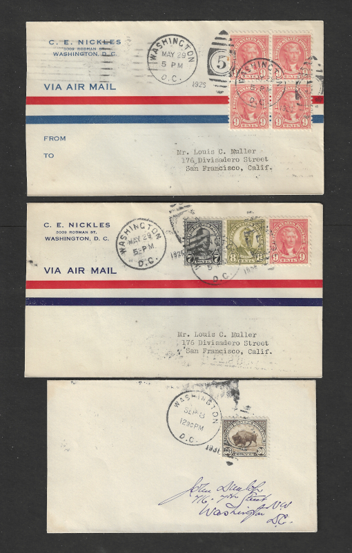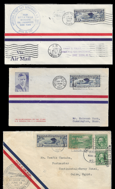 C10 "10 c. Lindbergh", June 18, 1927 Issue, 9 Diff. Cacheted F.D.C.'s, 3 Diff. City's, One was Mailed to Cairo, Egypt, Sound Cond., F-VF, SCV is $1,125.00 (Image)