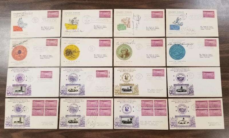 858 60 Diff. F.D.C.'s, "50th Anniv. of 4 States", Nov. 2 // 11, 1939 Issues, All with Cachet, Includes 15 Diff. Cmpt. Matched Sets (4 F.D.C.'s Each), All Matched Sets of Singles or Pairs are No Addr., Includes 2 Sets with "Crosby" Cachets (1 with Blks. of 4), Includes 2 Sets Signed by Mayors, All are Sound Cond., F-VF, SCV is About $800.00 (Image)