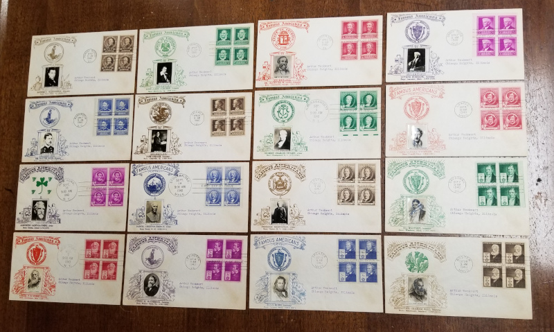 859-893 (35), "Famous Americans", 1940 Issue, Cmpt. Set of 35 Diff. F.D.C.'s, All with"Crosby" Cachet, All with Blks. (4 Stamps Each), Sound Cond., VF, SCV is About $1,200.00 (Image)