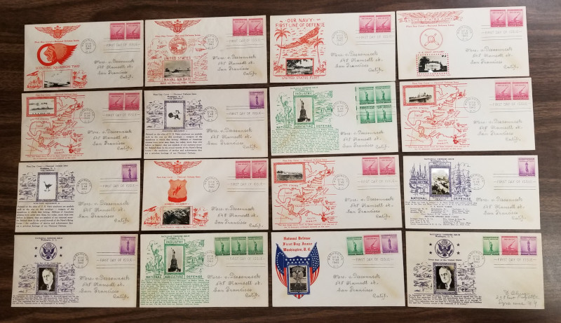 899-901 (3), "National Defense", Oct. 16, 1940 Issue, 173 Diff. Cacheted F.D.C.'s, Includes 28 Cmpt. Sets (Set of 3 on Single F.D.C.), Includes 23 Diff. with "Crosby" Cachet and 19 Matched Sets, Sound Cond., F-VF, SCV is About $1,450.00 (2. lbs.) (Image)