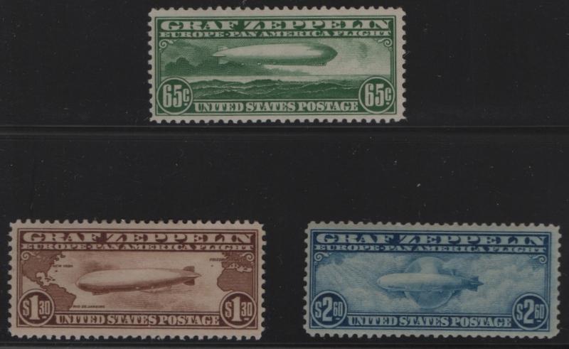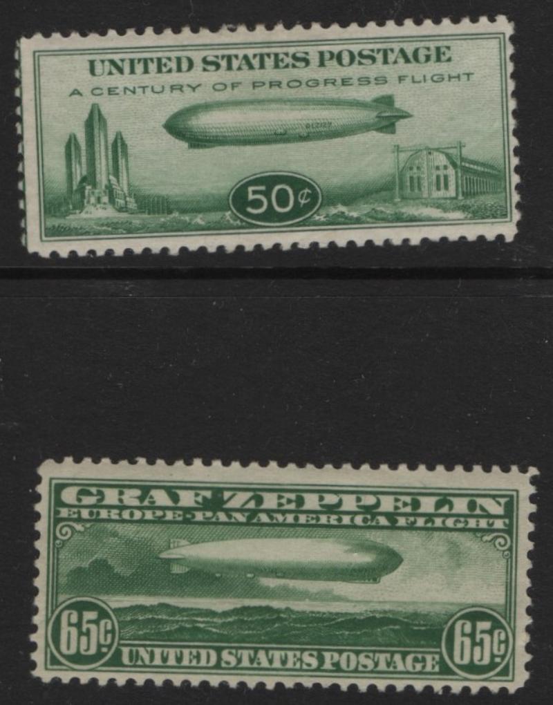 C13, C18 F-VF LH, Two Zeppelins, 65¢ green Graf Zeppelin, 50¢ green Century of Progress (Image)