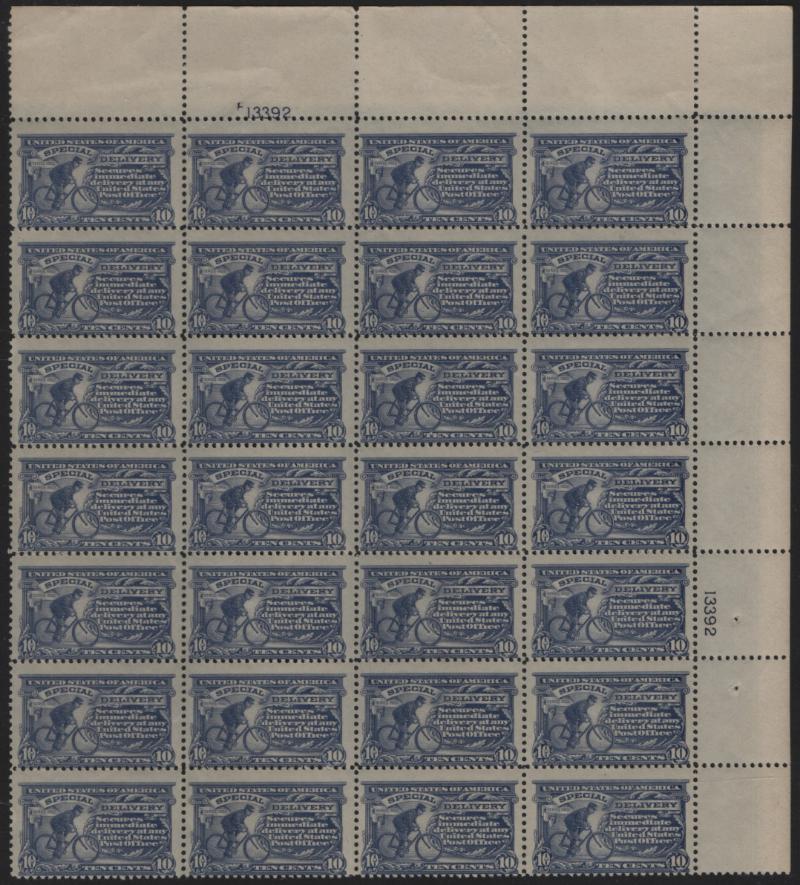 E11 Avg to Fine NH, Block/28 w/ (2) PBKs, 10¢ ultramarine bicycle messenger, pl# 13392 wide top & UR, few perf seps in right margin (Image)