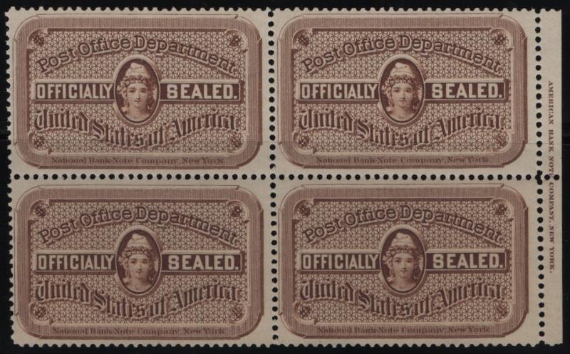 OX4 VF-XF NH, POST OFFICE SEAL Block/4 w/ imprint on side of 1881, w/ Crowe Cert of January 2019, deep brown Official Seal, bright color (Image)