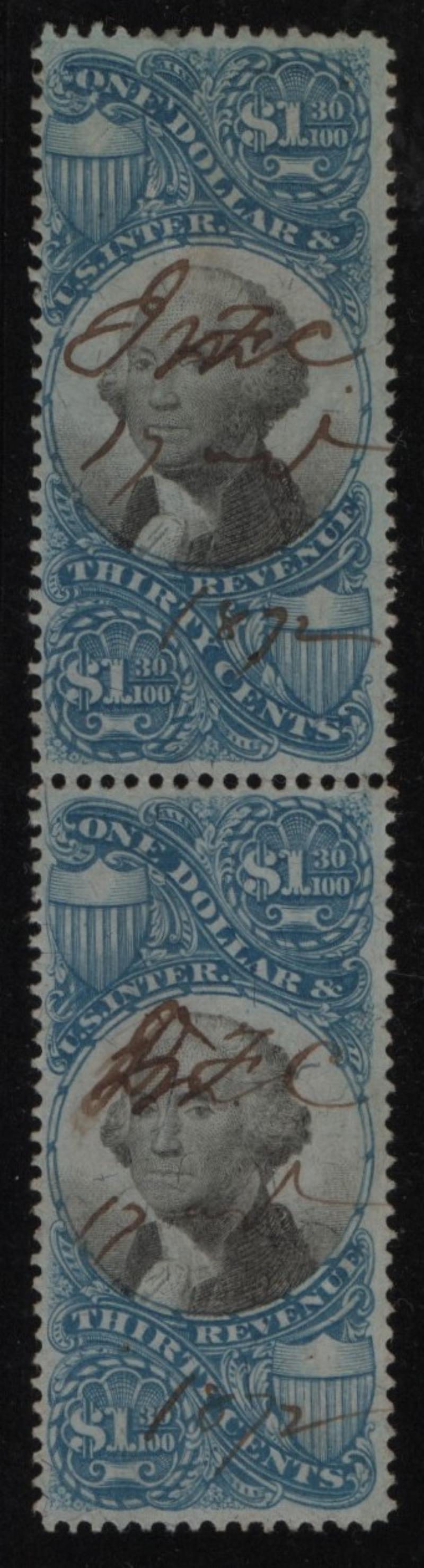 R119 VF Vertical pair, $1.30 blue & black, ms cancels (Image)