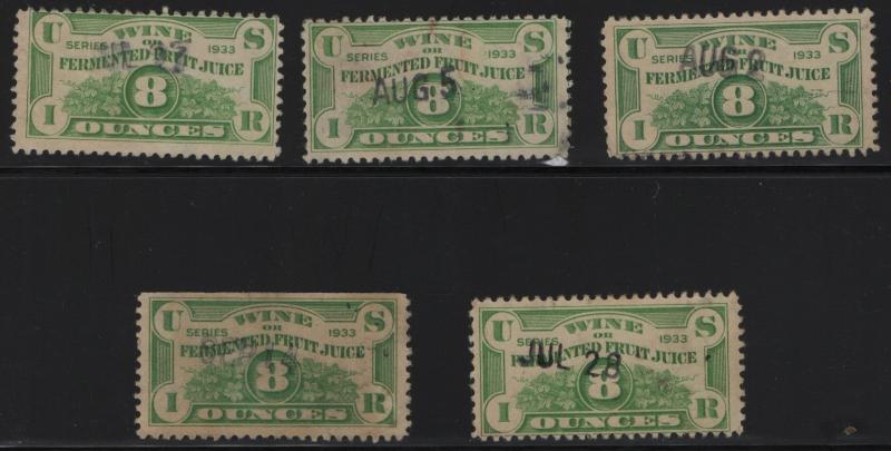 REF3 F+ Fermented Fruit Juice 8 ounces light green (5) used examples, hs date cancels, one NSE (Image)
