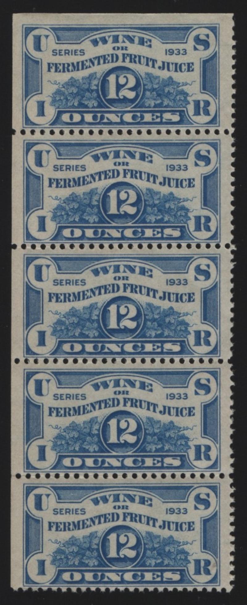 REF4 F-VF Fermented Fruit Juice 12 ounces light blue, V margin strip of (5), NSE at T and L; seldom offered in multiples, Scott CV for hinged (Image)