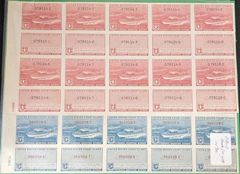 RVB1-RVB2 VF Blocks of (10) of $1 red & $3 blue boating stamps w/ plate # at LL, $3 is final #54534 (Image)