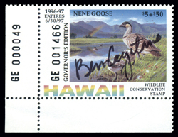HI1G(s), Hawaii 1996 Hand-signed Governor's Edition, signed by Ben Cayetano, Lower Left PNS no. 49, VF NH, 800 stamps issued Cat($95). Donated by Sam Houston Duck Co. (Image1)