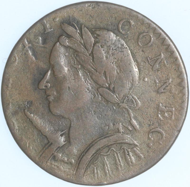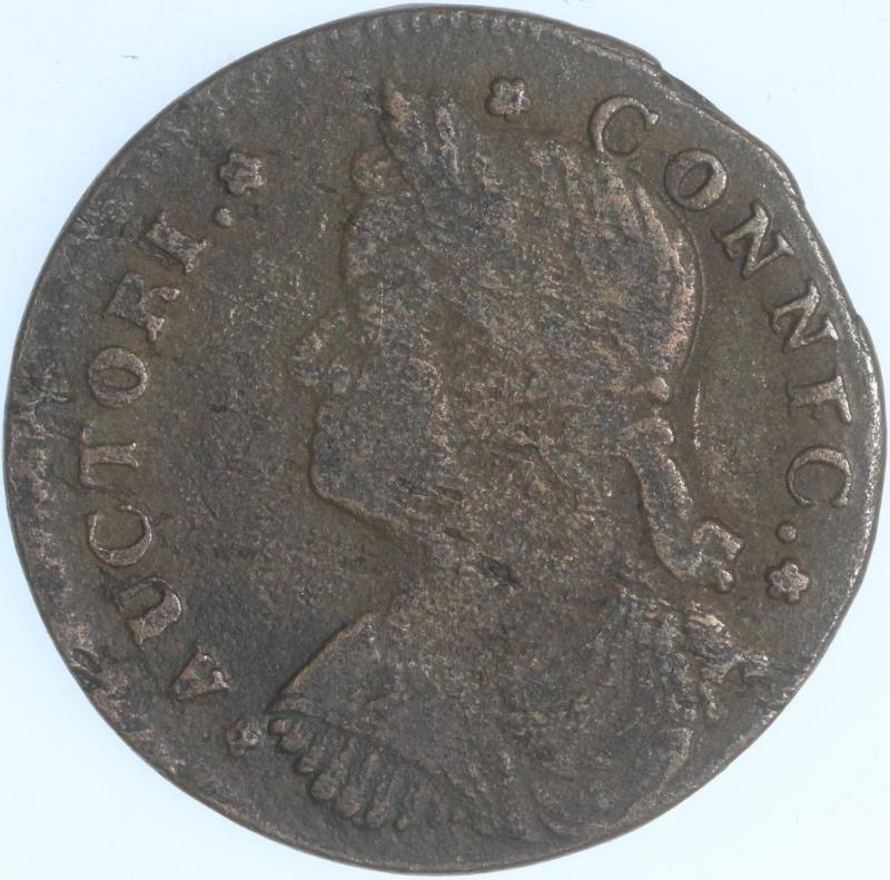 1787 Connecticut Cent Mailed Bust Facing Left. A rough planchet, typical of coins of the day, but detail consistent w/ a grade of VG or F. The date clearly identifies. (Image)
