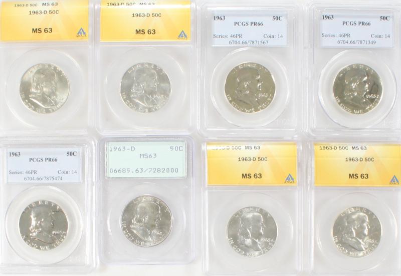 (17) total comprised of (13) 1963 or 1963-D ANACS-Graded mostly MS63 w/ a few lower and one higher (MS64), a 1963-D PCGS MS63 in an original "rattler" holder (the coin would grade at least MS64 today), plus (3) 1963 Proofs graded PCGS PR66. Inspect for a better look and assessment of value. (Image)