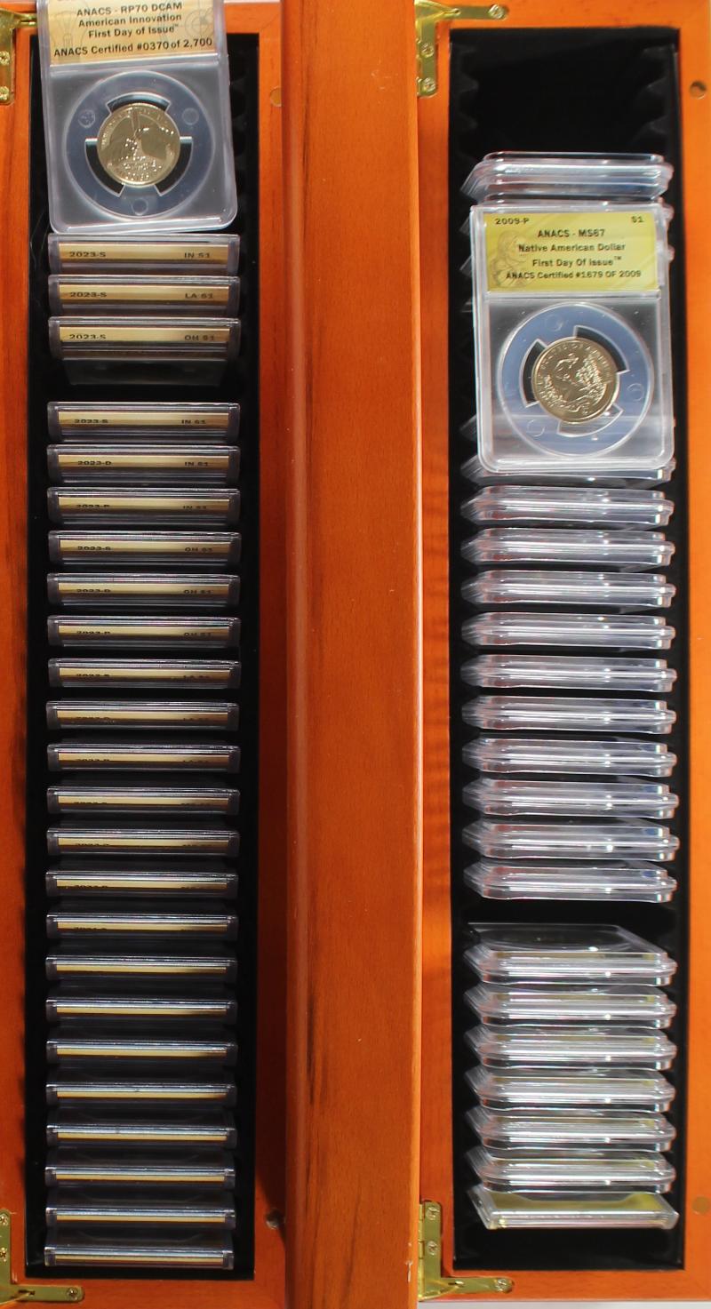 (106) Modern $1 Coins all ANACS-Certified (most MS67) incl (83) Innovation $1 and the rest Native American $1 all housed in (4) wooden 30-Coin slab boxes. Makes a nice display. (Image)