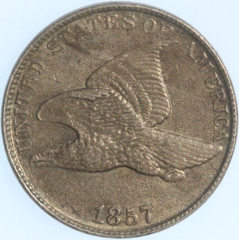 1857 AU w/ a small area of obv discoloration at K11. Still a very nice coin and exceptionally well-struck for a Flying Eagle Cent. Inspect! (Image)