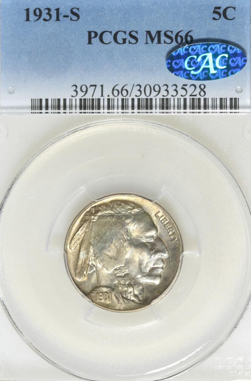 1931-S PCGS MS66 CAC-Approved. There is a small obv spot buried in the Indian's feather but the coin is 100% fully struck, and has full radiant luster with light rainbow toning on both sides. (Image)